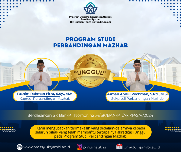 Jambi, 22 Mei 2024 – Program Studi Perbandingan Mazhab Fakultas Syariah, Universitas Islam Negeri (UIN) Sulthan Thaha Saifuddin Jambi, dengan bangga mengumumkan keberhasilan meraih akreditasi “Unggul” dari
