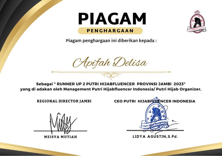 Apifah Delisa, mahasiswi dari Program Studi Perbandingan Mazhab, berhasil meraih posisi runner-up kedua dalam kontes Putri Hijabfluencer tingkat provinsi Jambi. Kontes yang diselenggarakan oleh Management Putri Hijabfluencer